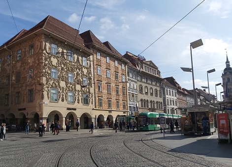 抵達維也納後,驅車前往奧地利第二大城市 ─ 格拉茲,於1999年被列入UNESCO世界文化遺產,保留著中世紀的風情文化,於最熱鬧的 ▲郝普特廣場上留下美麗的倩影,周邊林立著攤販加上教堂、噴泉,有如一幅典型的歐洲風情畫,還有▲城堡山及▲莫爾河之島都是攝影的好地方。
