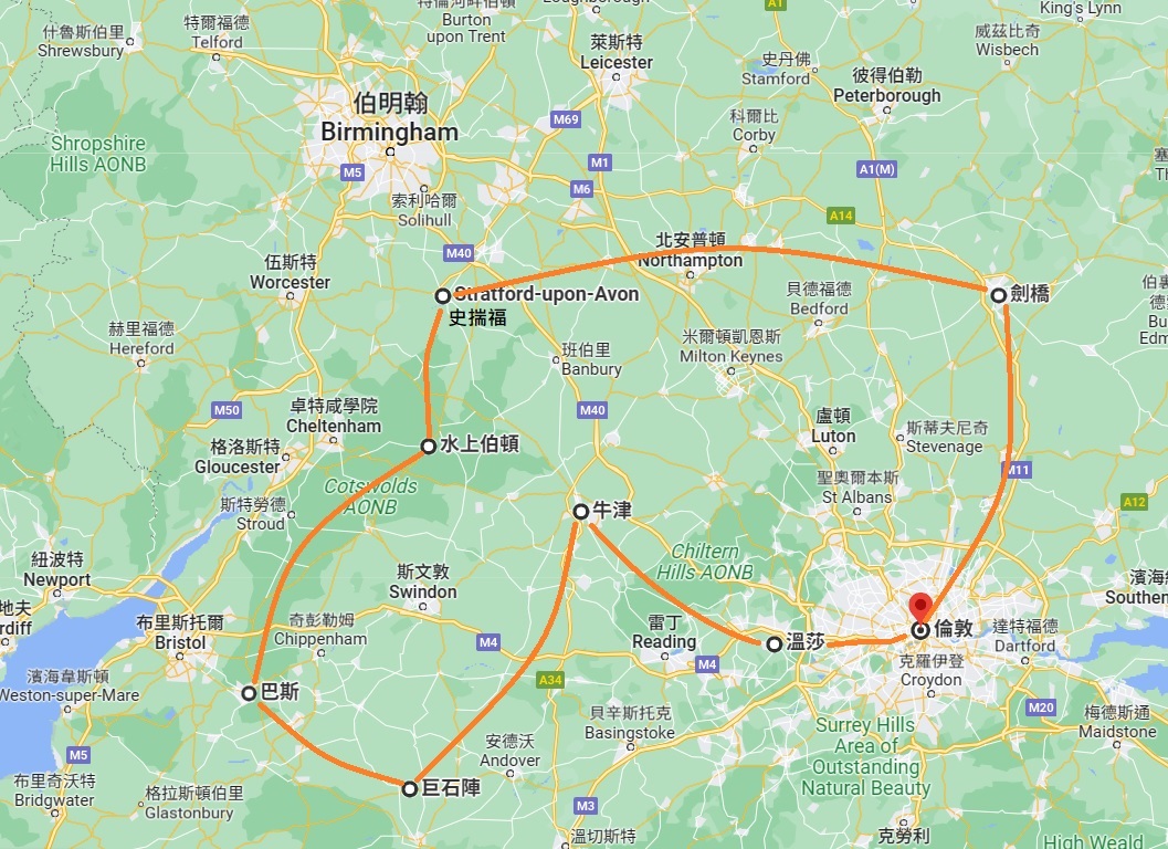 參考里程:倫敦—(115公里)—劍橋—(160公里)—史揣福